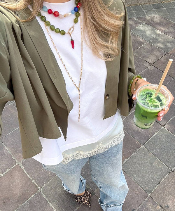 De Mystic forest necklace van Le Veer is met de hand gemaakt van prachtige mosgroene kralen in organische vormen.
