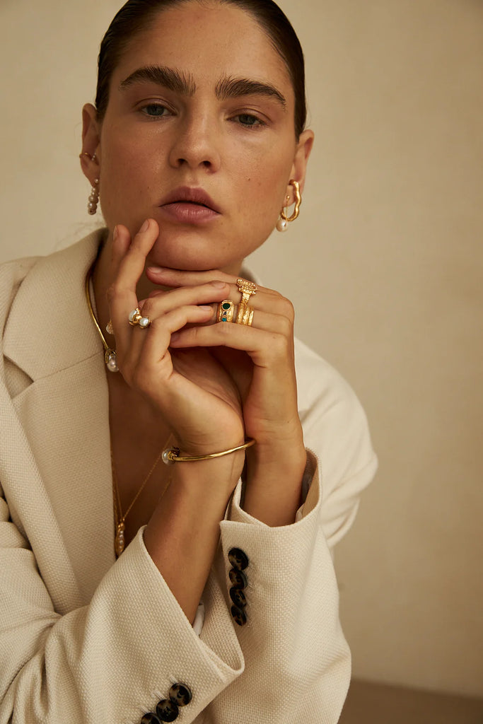 De Hanna ring van Mimi et Toi zijn drie ringen in één – een stijlvolle samensmelting van speelsheid en harmonie. Deze gehamerde band heeft verweven texturen die het licht vangen en meebewegen bij elke handbeweging – een ode aan individualiteit en vrouwelijke kracht.