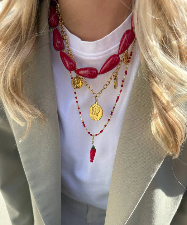 De Muse necklace red van Le Veer – een icoon met opvallende, druppelvormige kralen.