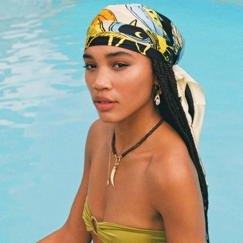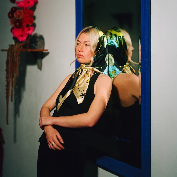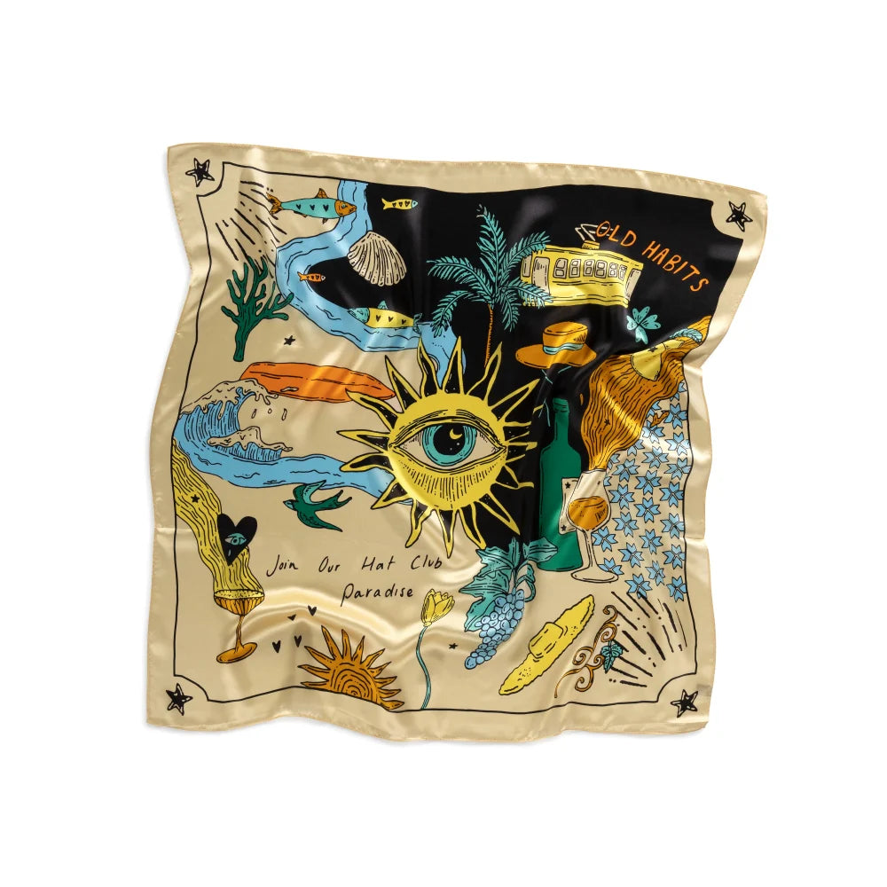 Deze bandana maakt deel uit van The Bandana Collection van Old Habits Die Hard en is ontworpen door de Amsterdamse designer Demi Hoekstra, die culturele verhalen tot leven brengt in draagbare kunst.