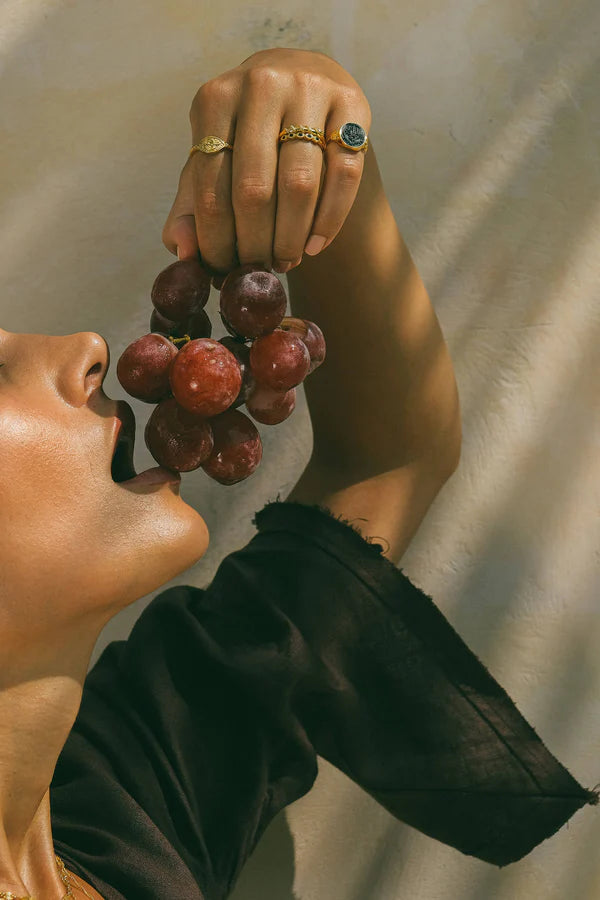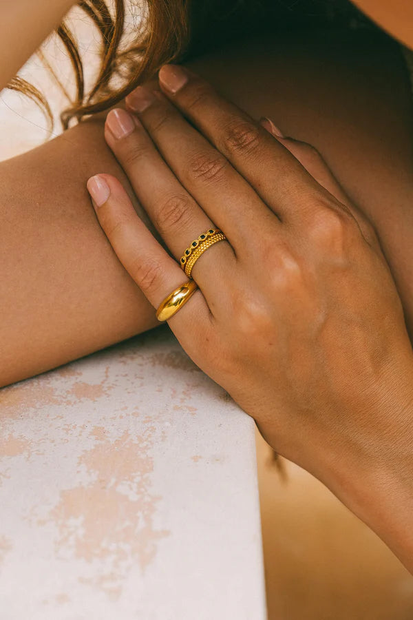 Protect yourself from evil. Deze minimalistische stacking ring is geïnspireerd op het boze oog, een eeuwenoud symbool van bescherming. Het subtiele design van de Evil eye ring van The Spice of Life en de zwarte onyx steentjes geven de ring een verfijnde, speelse uitstraling. Perfect om te combineren met andere ringen voor jouw ultieme ring party.