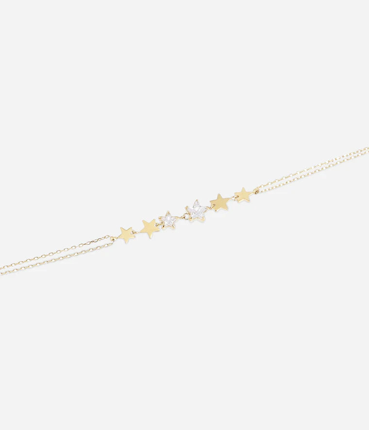 De Akiva bracelet van Zag is een trendy armband welke gemaakt is van verguld stainless steel. De armband heeft meerdere sterren die verbonden zijn door fijne schakels. Twee sterren zijn afgewerkt met fonkelende zirkonia voor een subtiele sparkle.
