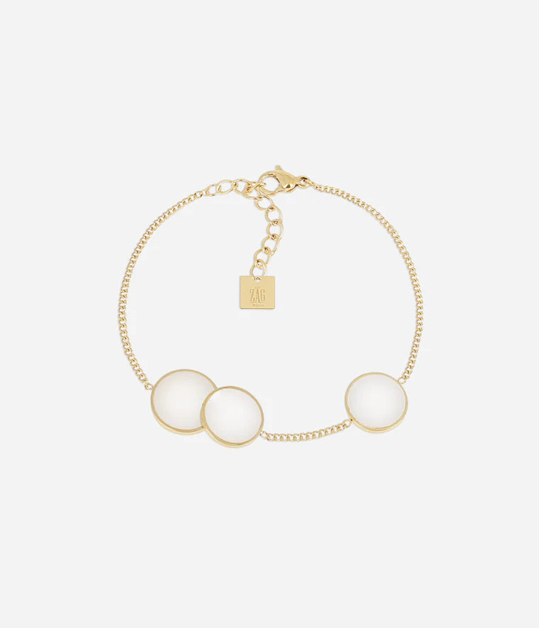 De Anouk bracelet van Zag is gemaakt van verguld stainless steel en is versierd met drie parelmoeren muntjes. Draag hem solo of combineer met andere armbanden voor een stijlvolle, gelaagde look.